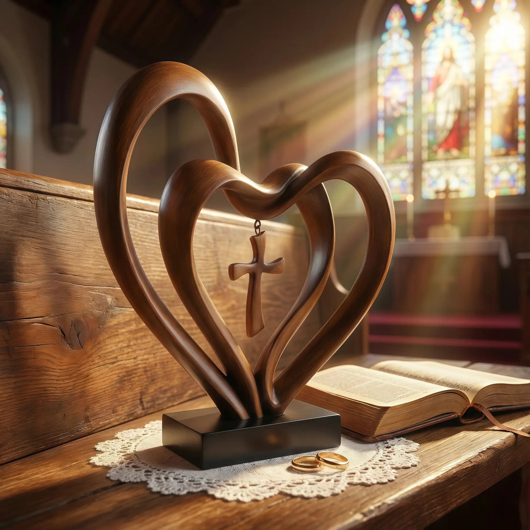 💏 A házasság hármas“ — Keresztény esküvői szobor összefonódott szívvel és kereszttel ✨